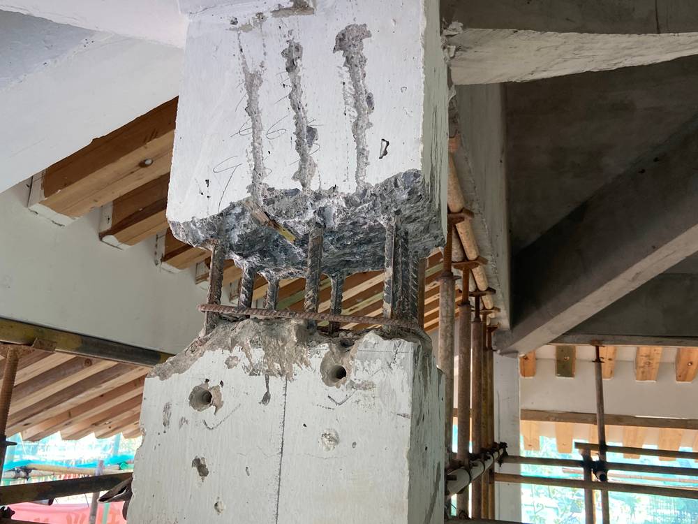 在支撐系統布置完畢并完成荷載卸除后,可以開始對原有梁柱進行拆除。由于原有梁柱中可能仍保留有一定的承載力,因此在拆除過程中需要謹慎操作,避免對結構造成二次損傷。拆除時,可按照預定方案分批次進行,逐步剔除外周混凝土,保留中心混凝土,以減小對結構的影響。