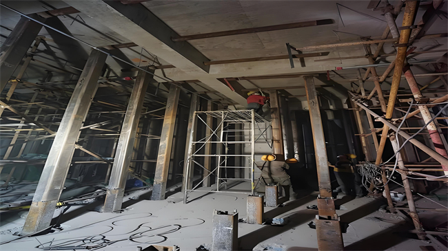 支撐系統一般采用組合鋼管支撐,通過鋼管與鋼板形成剛性連接,并在組合鋼管下端設置螺旋千斤頂。通過千斤頂的頂升,逐步將梁柱上的荷載轉移至支撐系統,從而實現梁柱的卸載。在卸載過程中,需要特別注意荷載的均勻分布,避免對周圍結構產生不利影響。